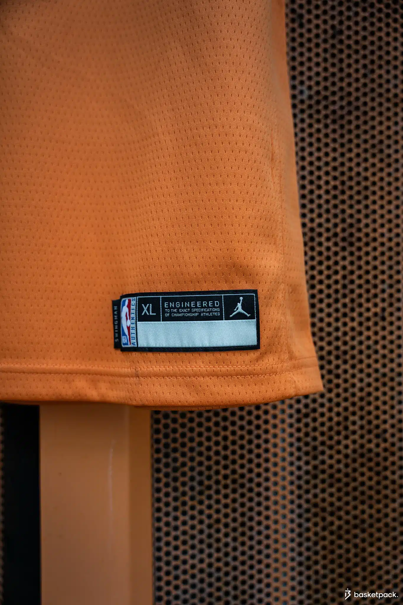 Le maillot Statement de Phoenix est floqué du jumpman de Jordan Brand, avec pour logo le symbolique ballon dans le soleil. Le surnom des « Suns » date de 1968 et vient d’un concours « name-the-team » : c’est alors le nom « Suns » qui avait été choisi devant les Cactus, les Rattlers et les Scorpions. Un nom qui fait référence à l’une des villes les plus ensoleillées des États-Unis. On distingue l’étiquette sur le bas gauche du maillot avec le logo NBA accompagné de la mention « Authentic » et le nom de la version du maillot, ici « Swingman » – soit maillot grand public.