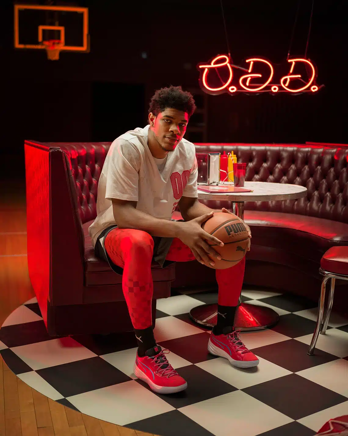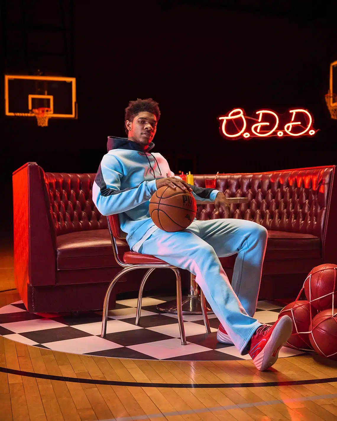 Cette PUMA All-Pro Nitro dédiée à Scoot Henderson possède une empeigne à tige basse au coloris rouge, en référence aux couleurs de sa ville natale de Marietta en Georgie. La paire est complétée par des bandes latérales bleues. Le sigle « O.D.D » que l’on aperçoit sur les leds rouge en fond ainsi que sur le talon de la paire font référence à la phrase « Overly Determined to Dominate » (« Plus que jamais déterminé à dominer ») chère à Scoot Henderson.