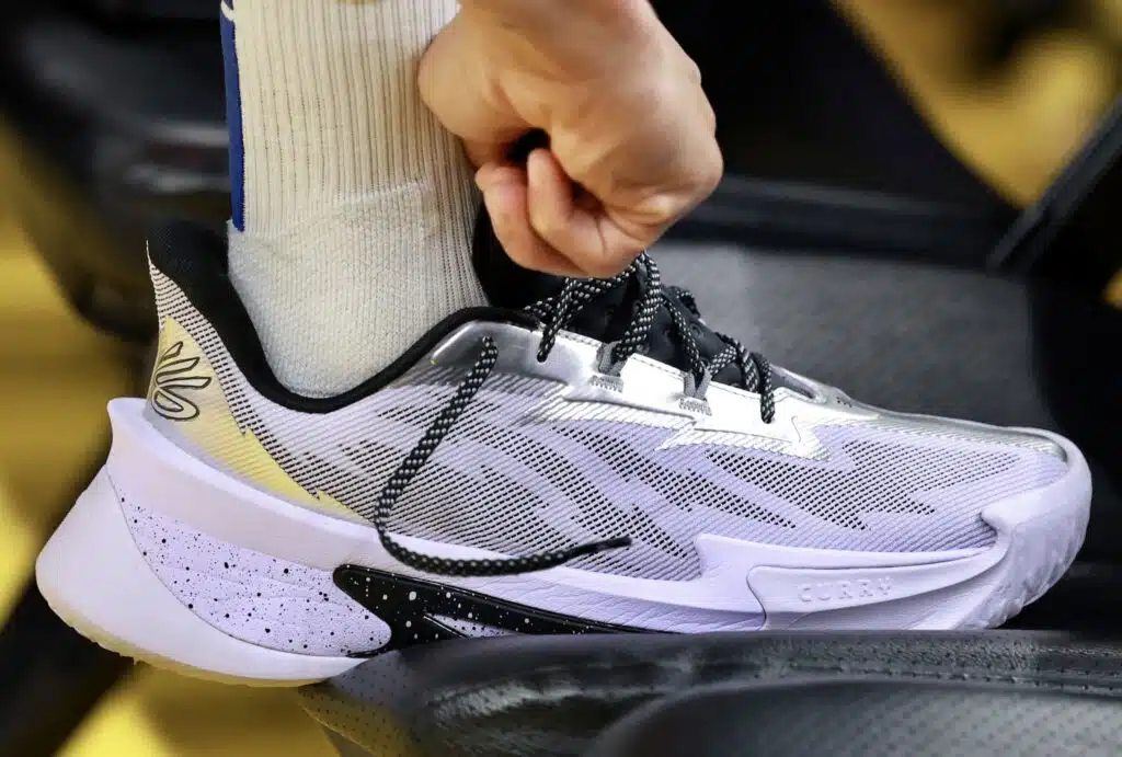 Le design de la Curry Brand Series 7 s’inscrit dans la continuité visuelle des précédents modèles, tout en accentuant certains traits. Le coloris noir, blanc et argenté mis en avant lors du match évoque une volonté de projeter une image technique et affirmée. Le logo Curry Brand est positionné de manière visible sur la languette et au niveau du talon.