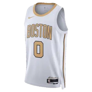Le maillot City Edition 2025-2026 des Boston Celtics a été dévoilé avec une base blanche, marqué de plusieurs détails dorés qui font référence aux 18 titres de champion NBA remportés par la franchise. Toujours dans cette optique de legacy, en bas du maillot figure la signature de Red Auerbach, entraîneur mythique des Celtics et figure incontournable de leur dynastie. Un clin d’œil qui fait écho aux bannières de champion suspendues dans le TD Garden, symbole de l’identité de Boston.