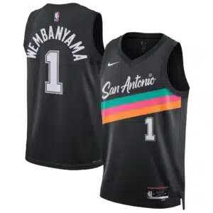 Quoi de mieux qu’un maillot iconique, qui est en plus porté par Victor Wembanyama lors de certains matchs NBA ?! Le maillot City Edition Fiesta des San Antonio Spurs reprend la base noire historique de la franchise et y associe les trois couleurs iconiques du thème Fiesta — turquoise, rose et orange — appliquées en bandes diagonales rappelant les tenues d’échauffement de la fin des années 1980. L’inscription « San Antonio » apparaît en diagonale sur la poitrine, dans une typographie retravaillée qui modernise l’esthétique tout en conservant l’héritage local.