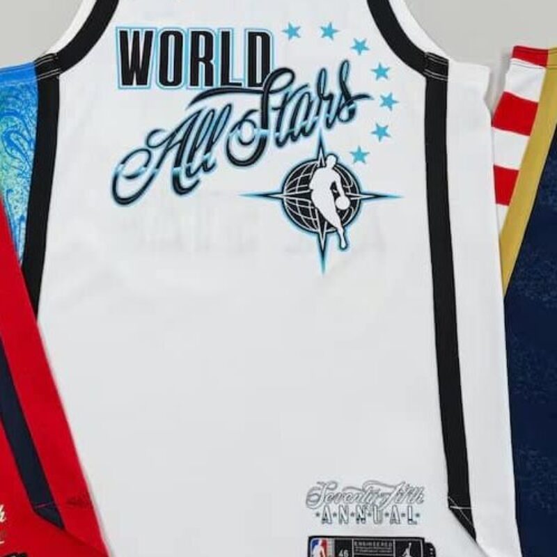 L’équipe World All-Star portera un maillot blanc, avec des panneaux bleus et verts le long du côté droit, symbolisant l’immensité des terres et des océans à l’échelle du globe. Cette tenue mise sur la lisibilité et l’équilibre, avec un design moins chargé que les maillots USA. Le choix de la sobriété permet à la Team World de s’imposer visuellement sans entrer dans une surenchère graphique, tout en affirmant une identité collective forte.