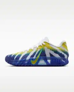 La première caractéristique du design de la Nike Ja 3 Murray State est marqué par son mismatch de coloris. Les deux chaussures inversent les couleurs. L’une domine en bleu profond, l’autre en jaune vif. Ce contraste immédiat répond à une réalité moderne : la visibilité. Aujourd’hui, une signature doit être identifiable en un instant. Un ralenti, une photo prise depuis les tribunes ou un highlight compressé sur téléphone doivent suffire à reconnaître la paire. Nike conçoit désormais ses chaussures signature comme des objets visuels autant que sportifs.