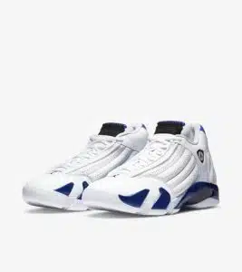 Aujourd’hui, on s’intéresse à une nouvelle édition de la Air Jordan XIV, une chaussure historique puisqu’elle a été la dernière chaussure portée par Michael Jordan sous les couleurs des Bulls. En effet, la Jordan 14 a été commercialisée lors de la saison 1998, soit celle du second threepeat des Chicago Bulls, avant que Jordan n’annonce sa retraite sportive. Avec un design influencé par Ferrari et imaginé par Tinker Hatfield, la Jordan 14 fait référence à l’amour de « His Airness » pour les sports automobiles. On découvre tout de suite la Air Jordan XIV Hyper Royal.