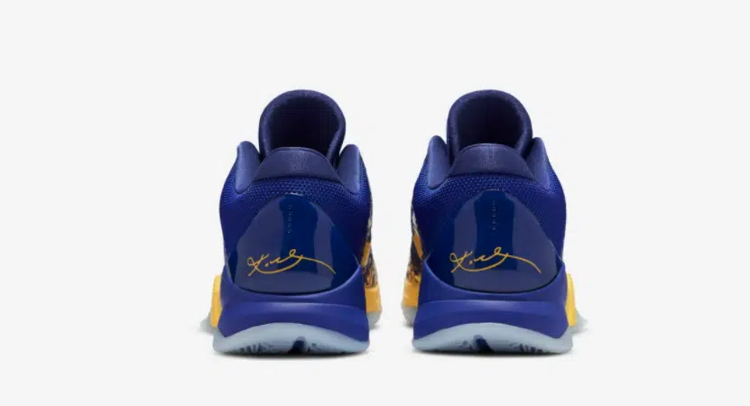 On ne va pas y aller par 4 chemins : on trouve le coloris « 5 Rings » de la Kobe Protro absolument splendide. Au-delà de l’hommage, et de la référence aux 5 bagues de champions glanées par Kobe Bryant, le design proposé est vraiment très réussi. On retrouve l’esprit « Purple & Gold » des Los Angeles Lakers, son équipe de toujours, dans le coloris de la Kobre 5 Protro 5 Rings. Comme pour les autres Protro, on conserve une chaussure basse. Sur son empeigne violette, on constate la présence de nombreuses inscriptions « Five » en jaune, bien entendu en référence aux 5 titres de champion du Hall Of Famer. On aperçoit la signature de Kobe au niveau de l’arrière du talon, en jaune. La Kobe 5 Protro 5 Rings est en réalité une réédition d’un modèle qui avait été commercialisé en 2010, pour célébrer le 5ème (et dernier) titre gagné par Kobe et les Lakers… c’était il y a 10 ans déjà, après une finale mémorable contre les Boston Celtics.
