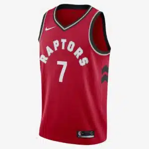 Nike est la marque officielle des maillots NBA depuis 2017-2018 et la fin de la “décennie Adidas”. Souhaitant s’adapter aux changements morphologiques des athlètes, (jugés plus athlétiques) la marque à la virgule propose une coupe proche du corps ainsi qu’un tissu absorbant pour limiter la transpiration. Pour souligner le changement de cap, Nike propose désormais l’appellation “Icon Edition” pour désigner les maillots portés par les Toronto Raptors à l’extérieur. Cette édition doit proposer un coloris fidèle aux origines de chaque franchise : ce sera donc le traditionnel rouge pour la franchise canadienne.