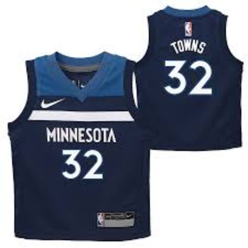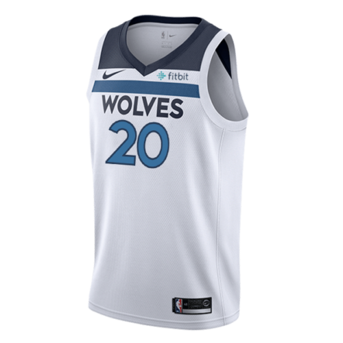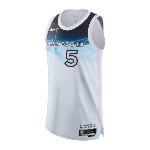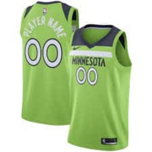 - Maillot domicile (Association Edition) : Blanc avec « Timberwolves » en bleu foncé et des accents de vert.
